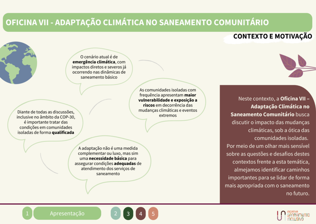 A oficina contou com uma breve abertura por parte da Iniciativa Saneamento Inclusivo, contextualizando a relevância da temática e as principais motivações que levaram à organização da Oficina VII, como a necessidade de se abordar as mudanças climáticas no âmbito de saneamento em comunidades com um olhar específico que reconheça as vulnerabilidades, prioridades e potenciais locais.
